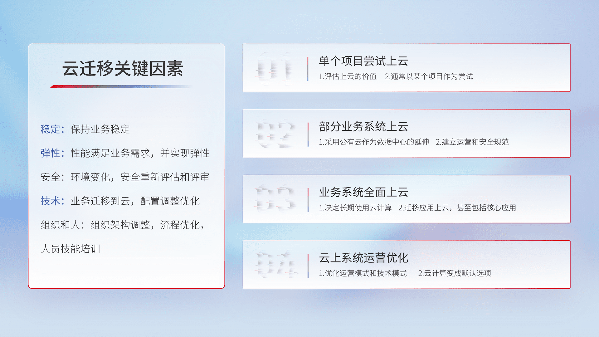 结合实际业务,,,,从规划设计、、、、云平台选型、、、云原生改造、、数据迁移、、集成交付,,,迁移全过程为客户识别最佳上云路径,,,做好风险识别管理,,,,设计网络架构、、、、身份权限、、安全审计合规、、操作审计、、日志审计、、监控告警策略、、多站点容灾设计等,,对云上基础设施进行整体规划,,提升IT治理水平,,,,以满足弹性、、、、高可用、、、、高性能的需求。。