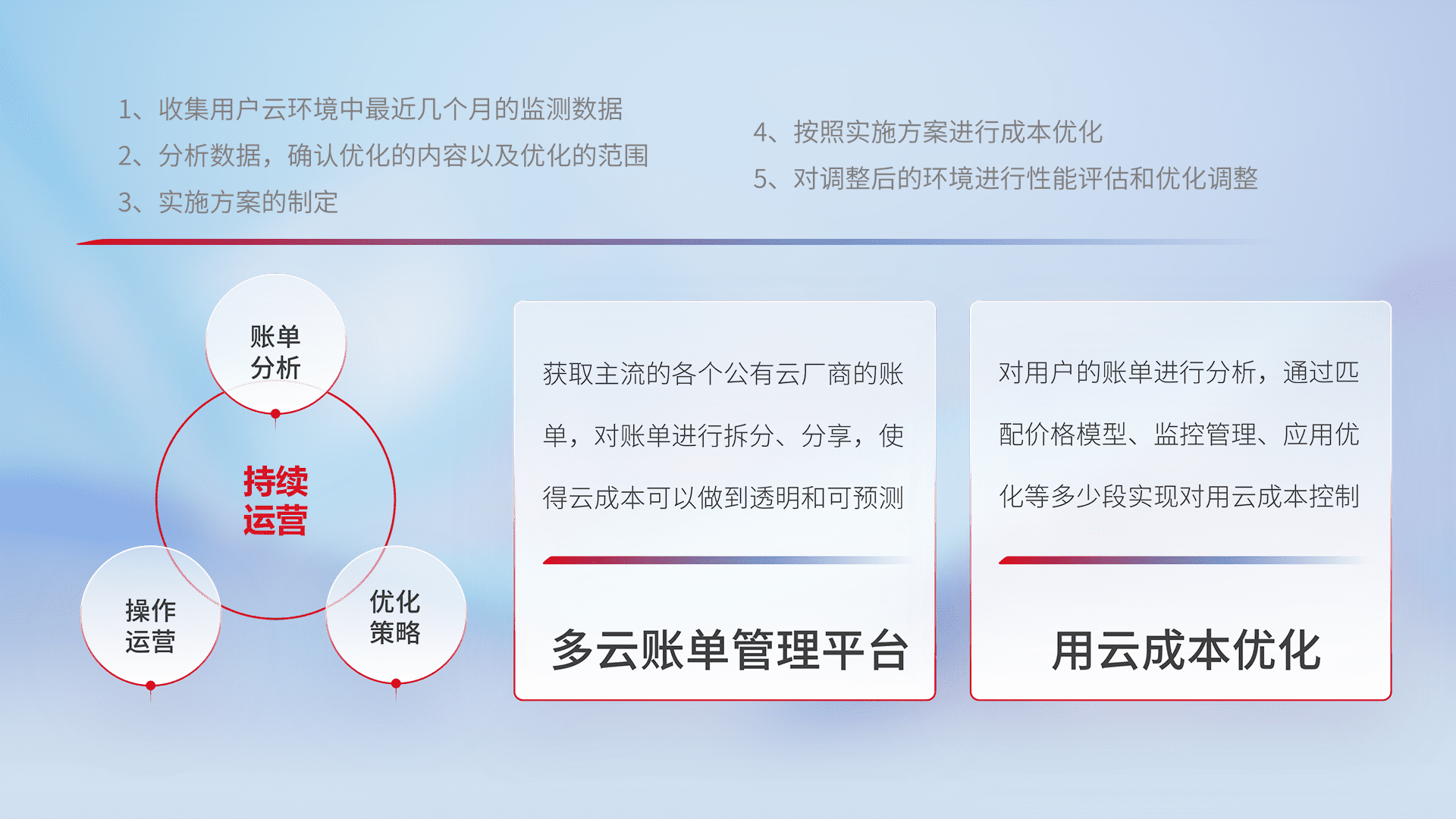 通过多云纳管,,,,以统一的资源数据模型把客户的云资源进行抽象和封装,,,,进而实现对多云资源的统一操作,,,,保障云资源管理的可靠性、、、、稳定性与可用性。。量身定制化运维内容,,配置、、开发运维、、补丁管理、、备份、、、、监控、、、、认证和访问管理、、审计和日常巡检等,,,保障在用云过程中的可靠度,,,,稳定度以及高可用率。。。