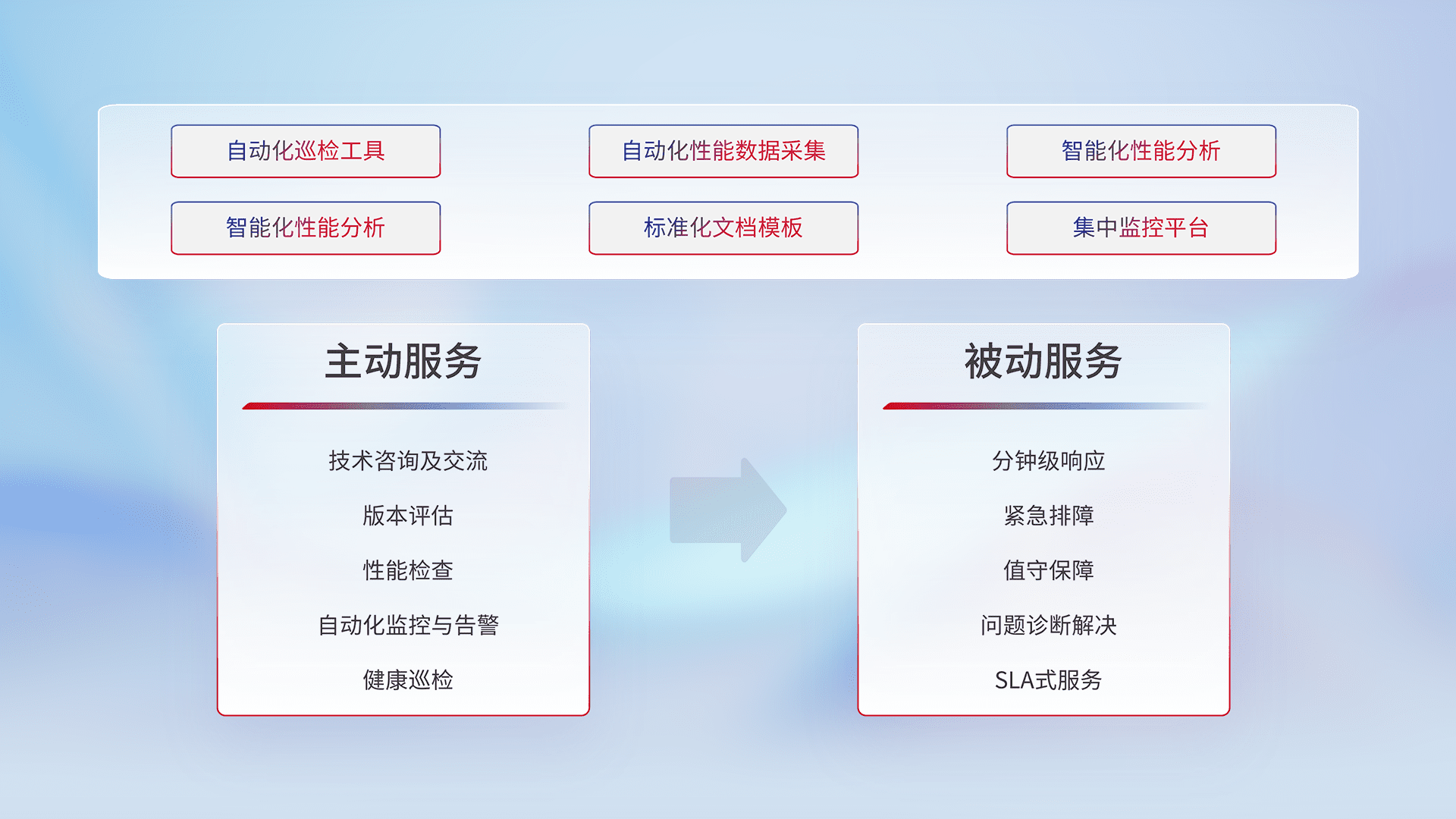 智能化工具和标准化文档,,保障服务质量,,,,提供主动服务(包含技术咨询、、、、版本评估、、、、性能检查、、、、自动化监控与告警、、健康巡检)和被动服务包含(分钟级响应、、、紧急排障、、、值守保障、、问题诊断解决、、、、SLA服务)。。